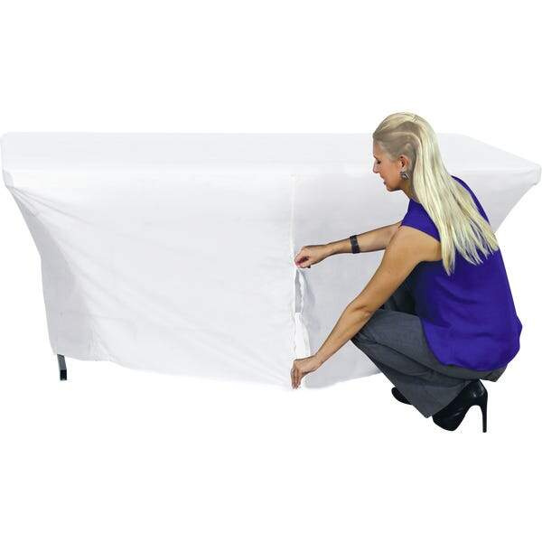 Complete your presentation with a stretch, dye-sublimated printed table throw. Stretch table throws are tailored to fit standard 8ft, 6ft,  from top to bottom, providing a stylish, customized, and branded appearance for use at events, trade shows and in retail environments. Table throws are fully printed on washable polyester using dye-sublimation and include a back zipper for easy application.